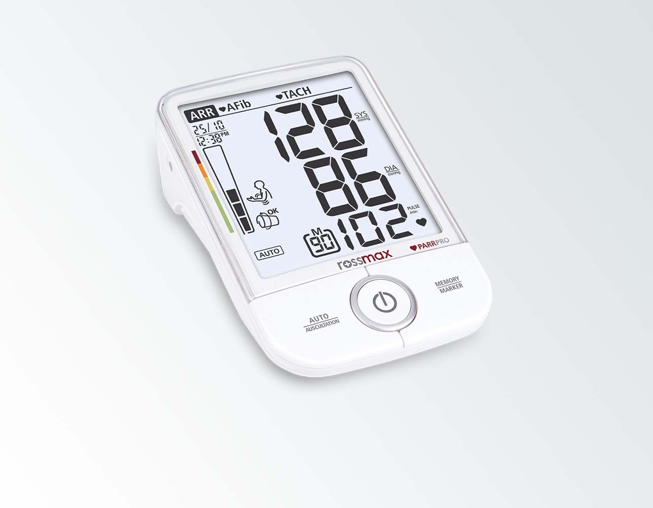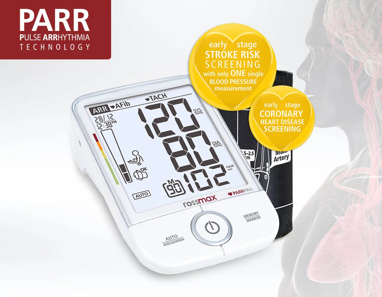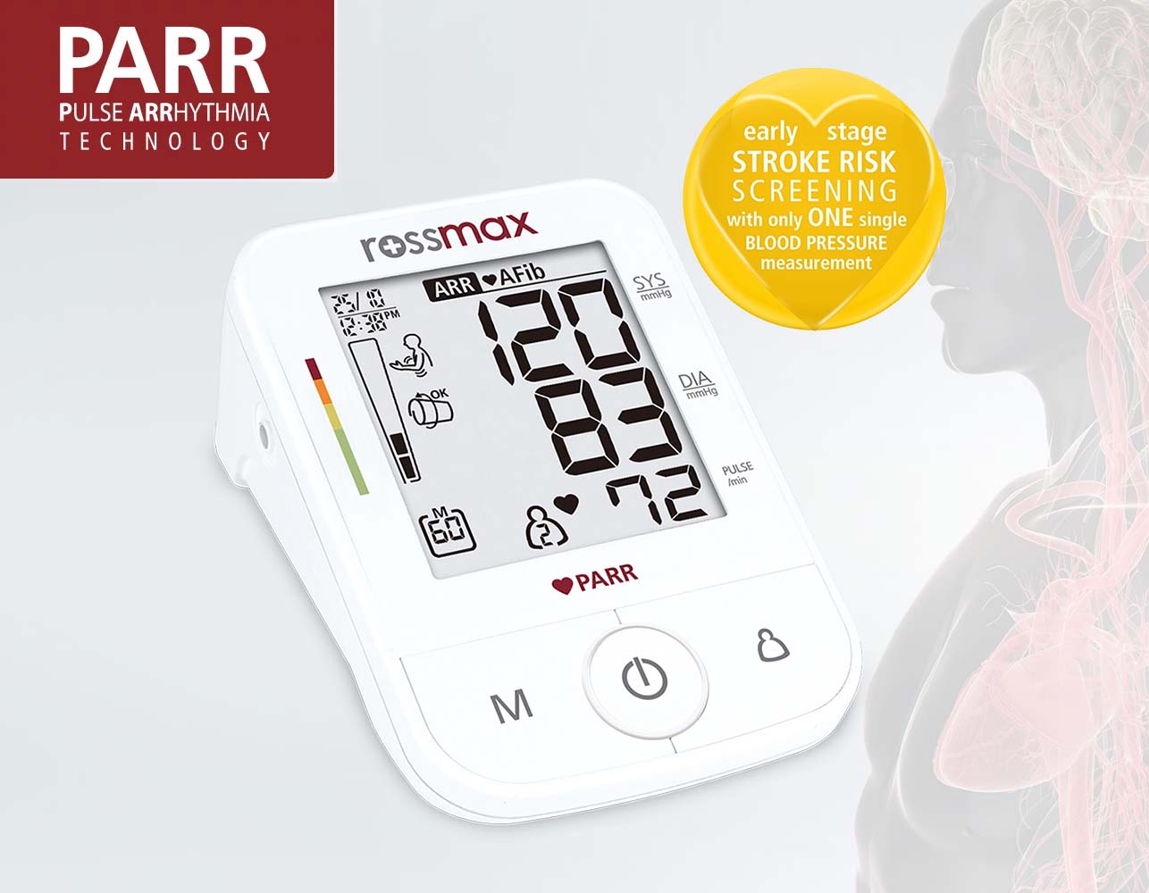 Monitorët Rossmax për tensionin e gjakut me teknologjinë PARR (aritmia e pulsit) bën të mundur dallimin në kohë për të parandaluar goditjet cerebrale dhe sëmundjet e tjera kardiake vetëm me NJË matje të tensionit të gjakut.